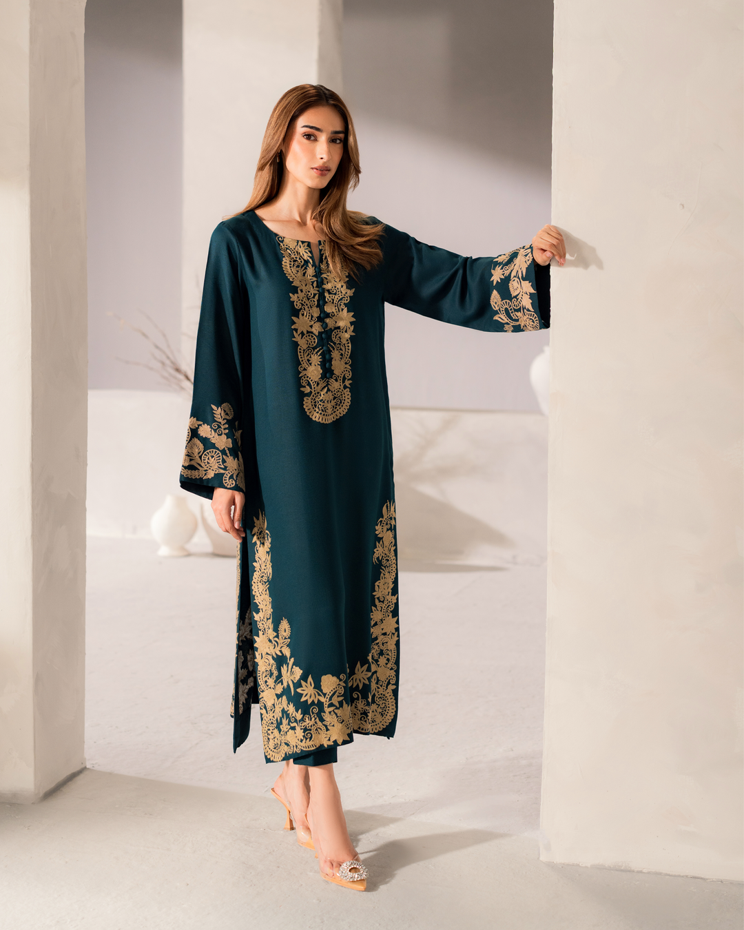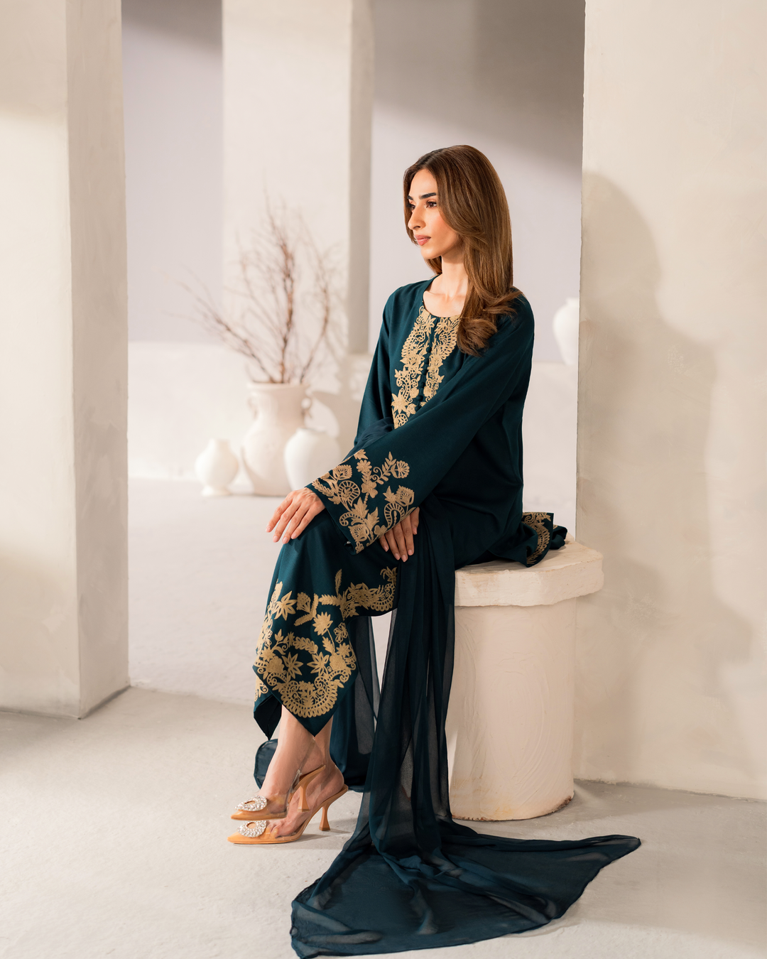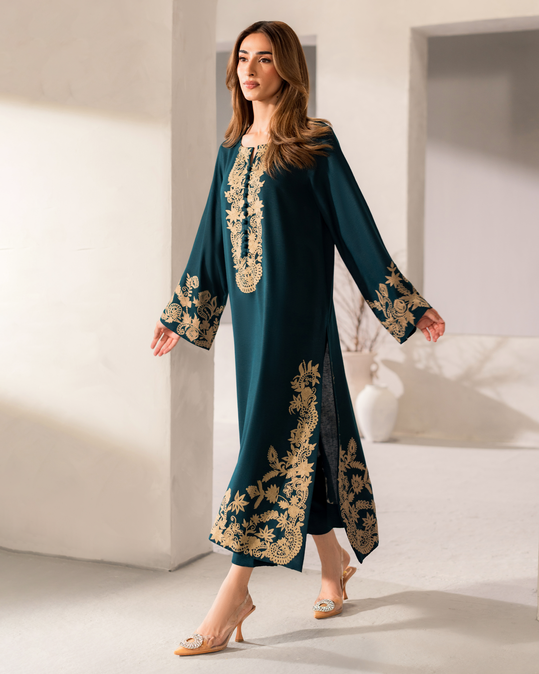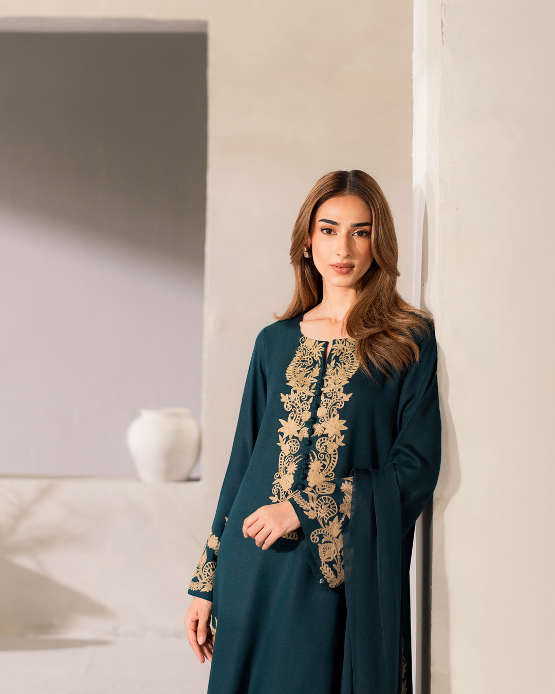 An Ode to effortless grace. A splendid ensemble in Emerald with intricate, beautiful print in dull gold on our premium silk fabric.