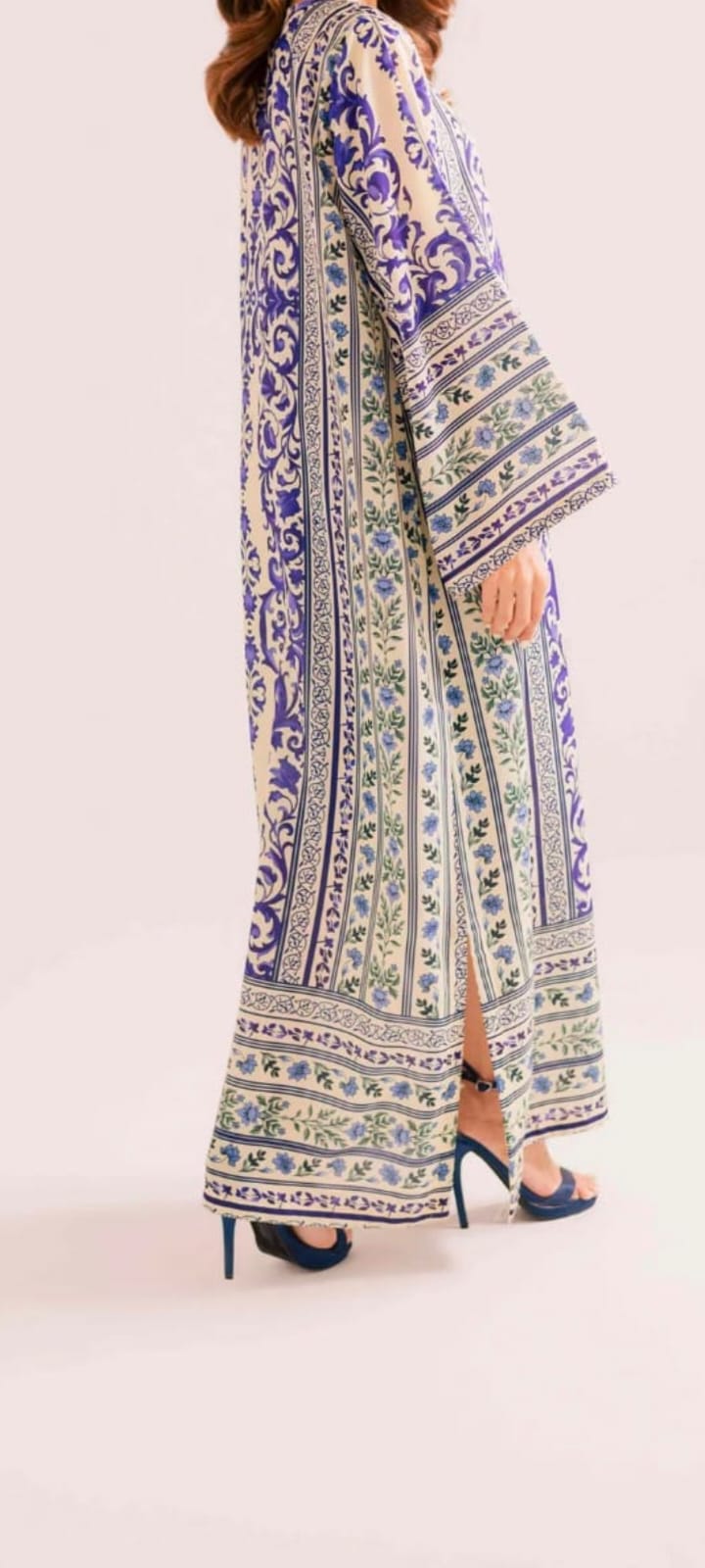 Elevate your everyday elegance with this beautifully printed kaftan, designed in a timeless cream base accented with rich cobalt blue and subtle green motifs. Featuring an intricate baroque-inspired print, this straight-cut silhouette offers a graceful fall and a flattering fit. The round neckline with a subtle slit adds a refined touch, while the full-length sleeves with detailed borders enhance its sophisticated appeal. Crafted from breathable, lightweight fabric, this kaftan ensures all-day comfort—perfect for casual wear, festive gatherings, or semi-formal occasions.